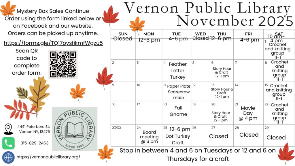 The Vernon Public Library was founded in 1903. In 1962 the library was moved to its current location on 4441 Peterboro Rd. This location was once known as the Old Carriage House, it was gifted to the library as a home base to serve the community in literacy and education.