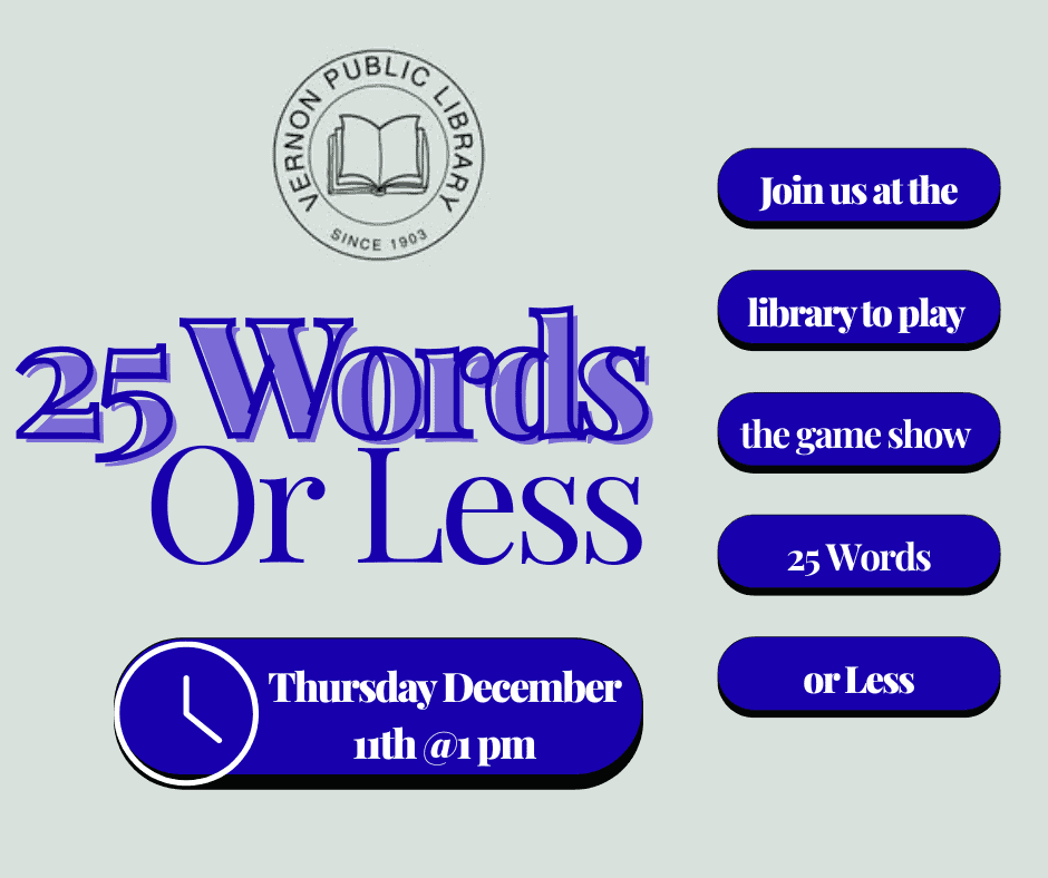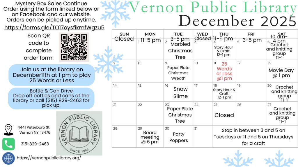 The Vernon Public Library was founded in 1903. In 1962 the library was moved to its current location on 4441 Peterboro Rd. This location was once known as the Old Carriage House, it was gifted to the library as a home base to serve the community in literacy and education.