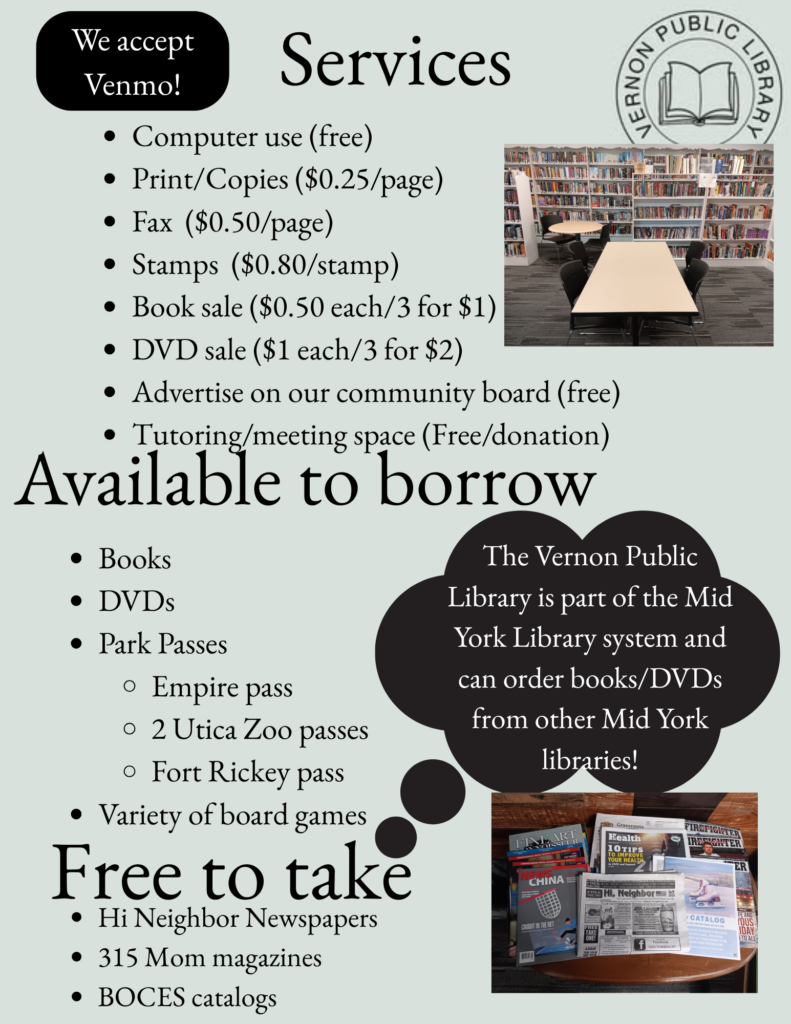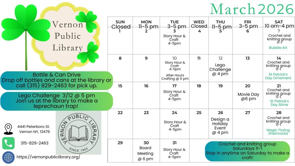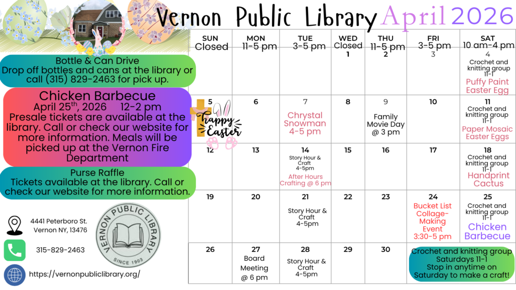 The Vernon Public Library was founded in 1903. In 1962 the library was moved to its current location on 4441 Peterboro Rd. This location was once known as the Old Carriage House, it was gifted to the library as a home base to serve the community in literacy and education.